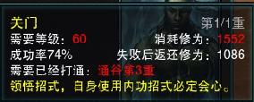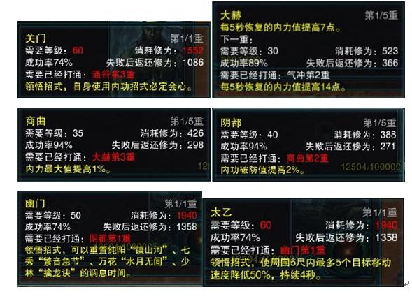 以及失败后反还的修为值,其实关门和太乙初始的成功率只有60%,这里可以看出任脉的重要之处了吧,所以还是适当优先打通几重下脘、中脘、巨阙对以后的经脉的发展比较有利的。值得关注幽门和关门穴,对应带脉的光明穴和外丘穴,均是让技能调息时间重值和内外攻击会心,,,,想象一下一个点了这个穴和没点的,有什么差别了,,,