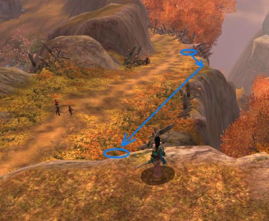 然后抵达的位置就是第二图所示的那个蓝圈处,这时蝶弄还有11秒-12秒左右,按照图示的蓝线跑(贴边跑,注意别掉下去了),依然可以轻松的穿过第2组怪的视线,并不会进入战斗。到了箭头末的蓝圈,直接扶摇跳上来……完成了,剩下的应该不用我多说啦,大家都会。