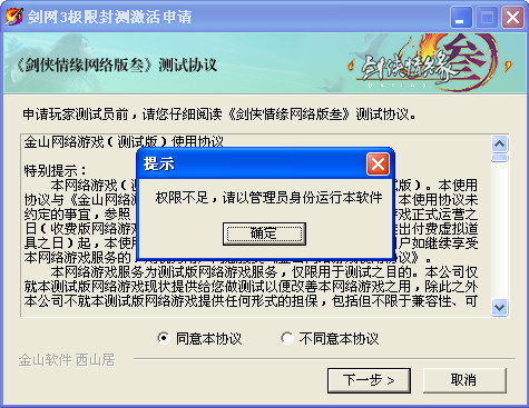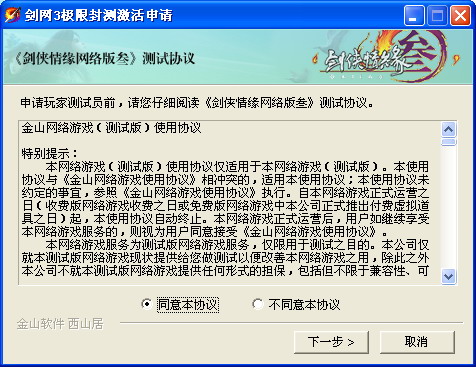 1.运行《剑网3》极限封测申请程序后,勾选“同意本协议”,点击“下一步”。