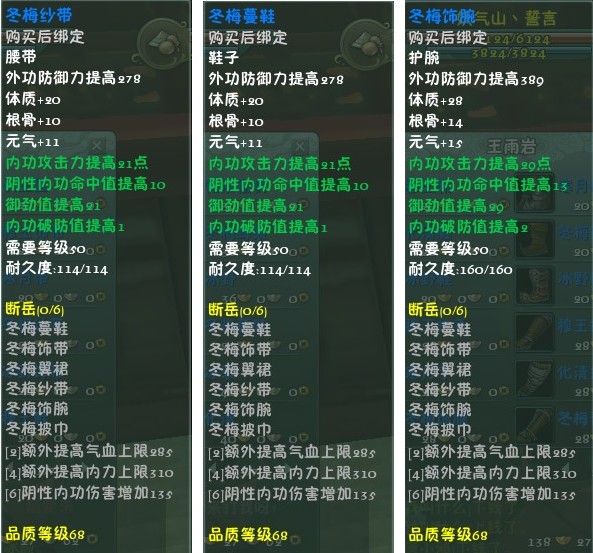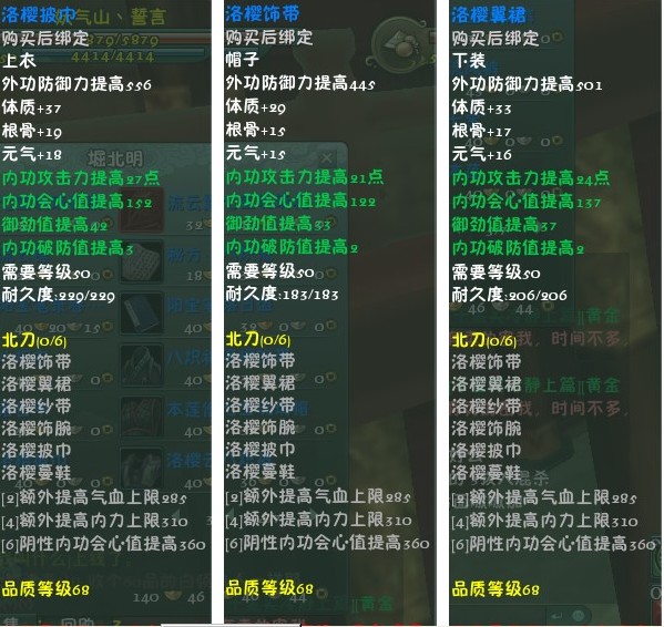 冰心的装备是比较好选的,一共有2种装备,一个是昆仑的断岳套装,一个是刀宗的北刀套装。看下面的图可以知道断岳套装是体质,根骨,元气高,绿属性加攻击,隐藏属性加135点攻击,而北刀套装是体质,根骨,元气低,绿属性加会心,隐藏属性加360点会心,不难看出断岳套装是高血高攻击,会心低,北刀套装是低血高会心,攻击低。对于操作好的,靠暴击杀人的建议选北刀套装 。