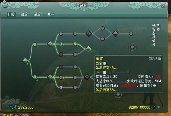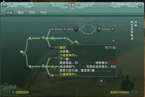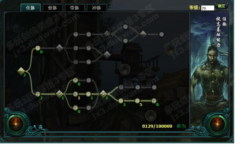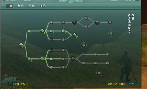 首先任脉点通“玉堂(提高水下闭气时间,过度穴位)——“石关(使自身可以修炼带脉)”——“玄机”(提高力道百分比2%-10%)——“廉泉(提高身法百分比)——“承浆(提高体质百分比2%-10%) 如果点满你将会看到非常的攻击和血量。