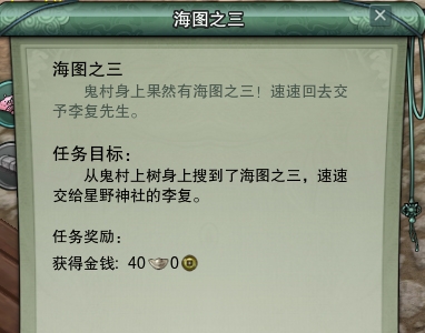 从鬼马鹿也手里骗取海图四,回到神社找李复交任务,完成海图四的任务。