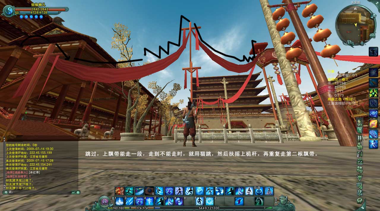 三角跳,和左右跳差不多,但也要单独说明,三角跳,用的地方比左右跳多。在建筑楼阁这之中行走如履平地,转角处用三角跳,被拌住,阻挡等浪费时间的情况就少了。配合冲和三个小轻功,你就可以在90度山的半山腰移动,想想被仇家追,这招多好玩啊,当然那样操作也不是容易的。