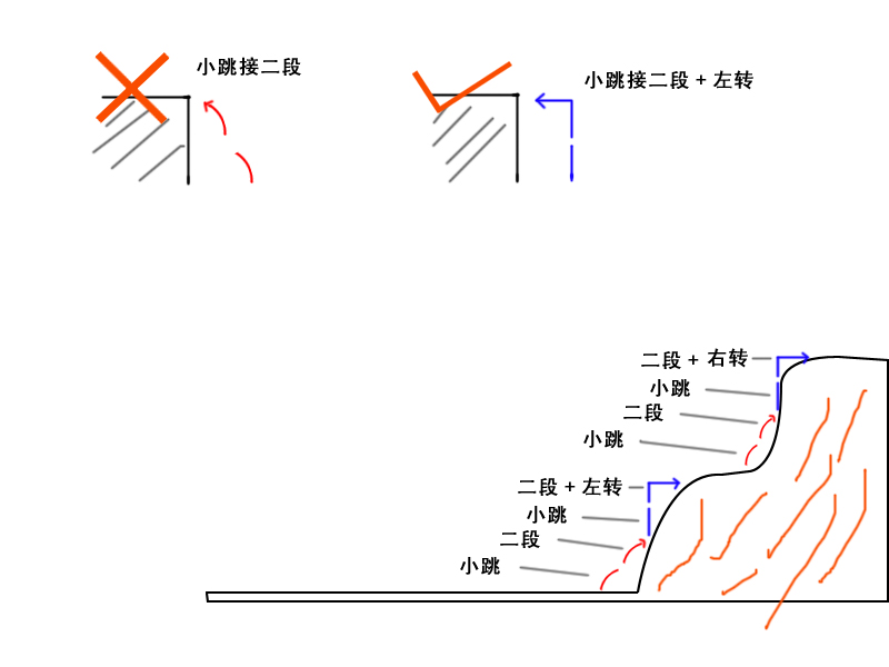 左右跳,操作图5有说明。左右跳,若你为了爬高,最好只在一座山的底层运用,因为如果你在半山腰用,多数情况会不让你回跳贴墙。一般对于80度的小山坡,只运用左右跳,即可过去。还是很方便的。再者当你跳上一个小土坡却又向下滑时,用不着后翻,直接左右跳,跳开再跳回就搞定。