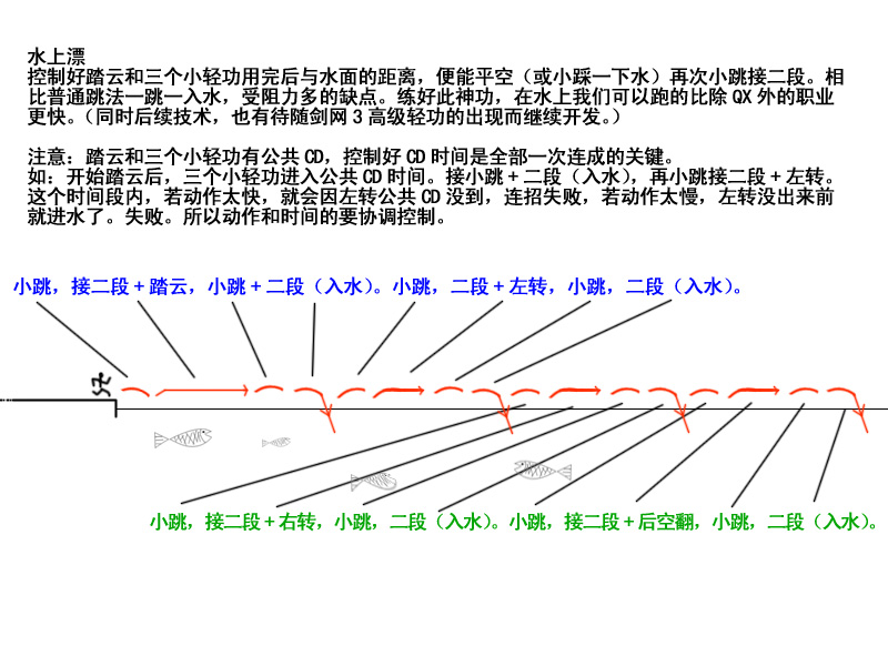 水上漂(首创),当时刚玩这招时,我的想法是,用气纯,先小跳接二段+冲,我想这时即然可以再小跳接二段,是不是我可以先开个梯云?然后不等全身入水便梯云跳起,同时重置冲的CD,于是再接冲,再小跳+二段……想的很美,实际运用中,在第一次冲完后,梯云有1秒公**,也就是说就算这时真能接个梯云,也要等这1秒的时间。把握好时间,还是有可能的,我试了两个下午。终于失败告终。我想出了高级轻功也许就有解决的办法了。