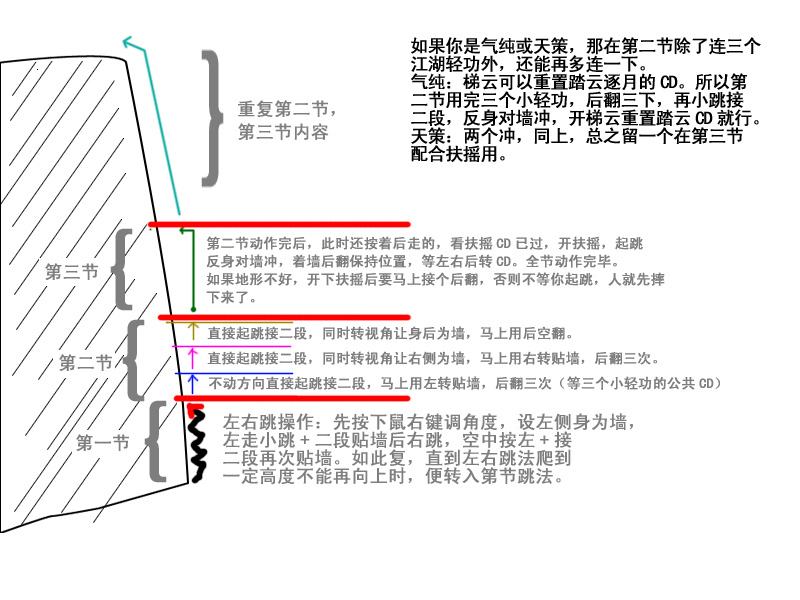 此文将带各位新手全面掌握爬山各种操作,招数和方法。其中内容绝对为全职业都实用的大众轻功,纯阳和天策为爬山优势职业,在此不多介绍,利用BUG也不在本文计论范围之内,大家若多爬爬山,自然学会运用。