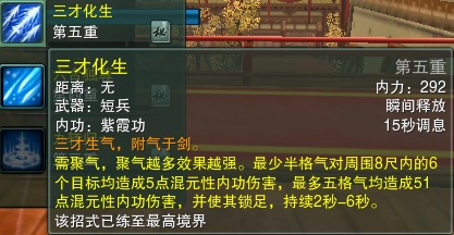 三才化生,一个让气纯又爱又恨的招式。爱它是因为他是气宗唯一的群控制,也是最常用的控制招式之一,冷切时间只有15秒。恨它为什么不是定身效果。