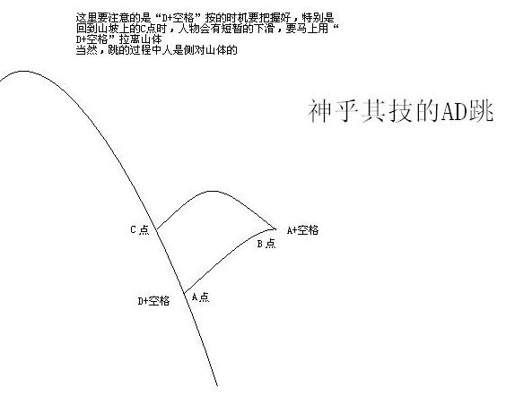 5、以前在某论坛看到一种神乎其技的跳法——AD跳,即左右跳——我试了一下,难度其大俺忘尘莫及,无聊的侠客可以尝试一下,跳法示意图: