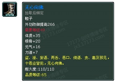 鞋子:无心向佛,荻花老三出。说起来,卫老三以前估计是和尚吧,搞那么多和尚装备在身上。这不是找推么?