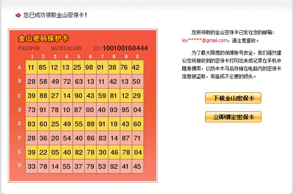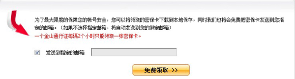 点选“免费领取”后,则页面跳转到成功领取金山密保卡的界面,如图:
