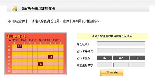 点选上图中的“立即绑定密保卡”选项,跳转的页面中,需要您输入“注册时的***号码”、“密保卡序列号”及“密保卡坐标所对应的数字”