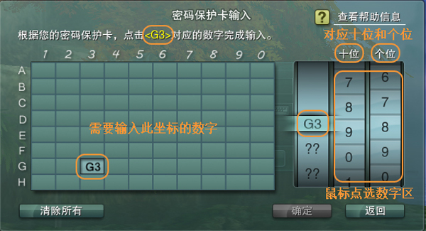 如上图,就需要您在绑定的密保卡上找到对应G3位置的数字。密保卡上横排是以字母标注,竖排是以数字标注,两个坐标的焦点就是需要输入的数字。