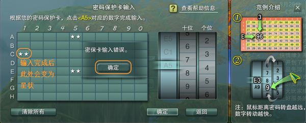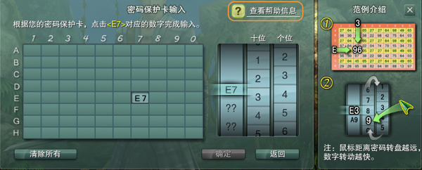 成功绑定密保卡后,启动剑网三客户端,登录帐号后,会出现密保卡的输入界面,界面左边是与密保卡布局一样的坐标区,右边是滚轮状的数字点选区,数字是在不停的进行转动的,且鼠标越是远离该区域,数字齿轮转动的越快。并且在滚轮区和坐标区会给出第一个坐标,您需要对照密保卡并点击对应的数字进行输入。输入完成后,系统会给出第二个坐标直到三个坐标都输入正确后进入游戏创建角色界面,见图:
