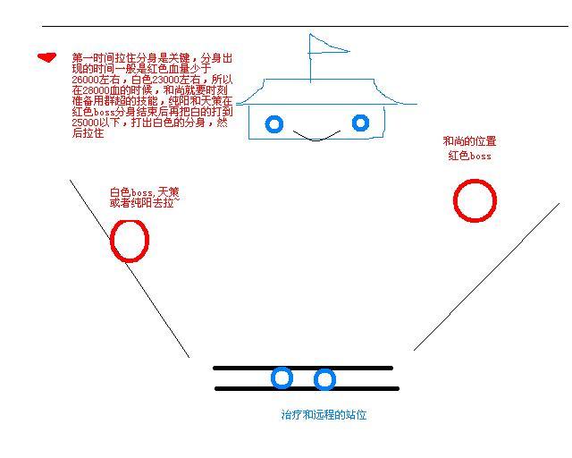 两个boss是要同时击杀的,我建议的击杀流程是这样的,先把红色boss的血打到28000左右,再打白色boss也到28000左右,然后打红色boss,这时候红色boss在2w5000左右会分身,和尚时刻注意拉分身的仇恨,然后boss分身,和尚拉住,其他人就打白的。不要太猛,尽可能的等红boss分身结束后打出白色分身。当然熟练的队伍一起打出分身都没关系,轮流打对场面的控制有利一些。如果2个boss的分身都顺利地拉住了。那么恭喜你们你们基本上过了,最后2个boss都2000血以下就拉到一起杀了。因为红色boss先分身所以尽量要先杀红色boss。dps不够的队伍会导致红色的分身两次,这时候再次注意拉住分身就行~~~2个boss要在5秒内同时击杀才能赢~~~~~~~~