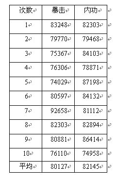 在都用暴击装备时本人三围(内功/暴击/破防)为1726/25.37%/14,用内功装备时为1817/22.05%/20.以上都是无BUFF时的情况。然后以扬州的1级木桩为目标,用四象轮回输出,每次时间3分钟(蓝就够三分钟的),轮流换装备,各10次,所得数据如下,伤害数值用大脚插件统计,均是无BUFF的情况下。