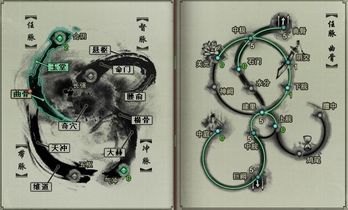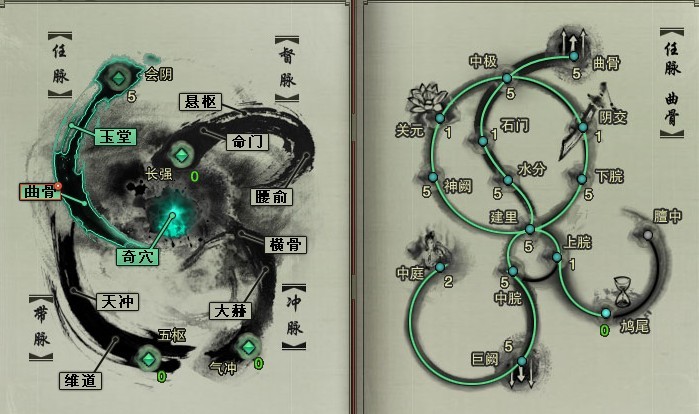 1、在点寰通至【任脉·中庭】前,首先最基本的激活至巨阙(5),可以减少修为的用量。