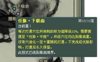 打通十重【任脉·下级俞】后,可以进行洗经伐脉,因为奇穴不受洗经伐脉的影响,打通后永久保留,注意:见好就收,未必一定点到十重。再次重新点【任脉·曲骨】的时候,就可以按照你的职业来选择分支。