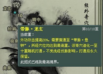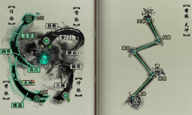 以下仅以触发【奇穴·龙玄】为例,注意看下触发的条件:五枢(5)→天冲(5)→目窗(5)→承灵(5)→光明(1)→悬钟(1),从以上触发条件可以看出,不仅仅目前的穴位全部达到最高重,还有五枢、气冲和长强都要达到最高冲。
