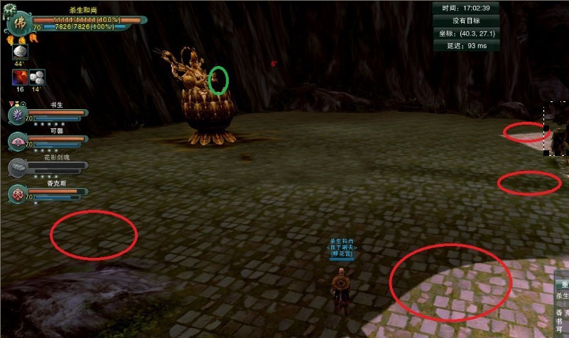 而触手是每隔一定时间刷新在队伍中随机4个队员脚下的。所以我们采用双治疗,其中,7x站在boss的台子上,承受boss的伤害,并给自己刷血,剩下的4人分别分散站在远离boss的地方,我们采用的是万花站在其中的一个角落,和尚、纯阳、天策则分散站靠边。