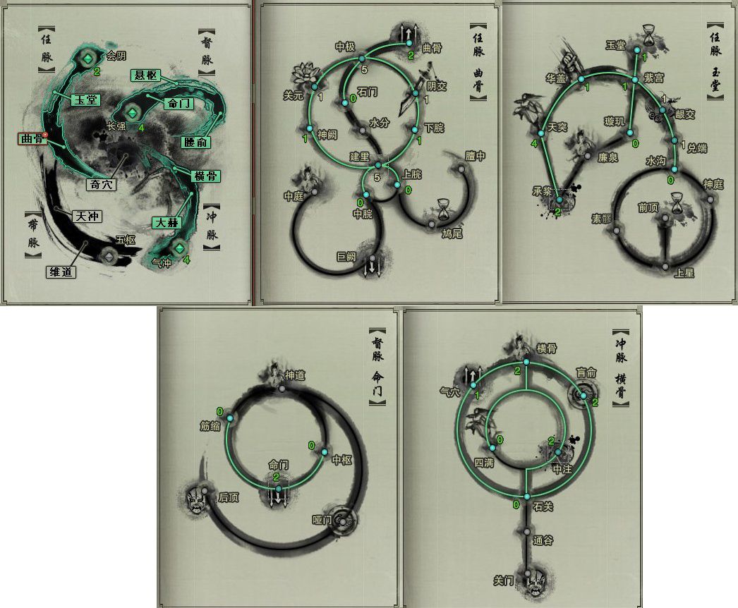 10w修为的图我就不附了,因为要考虑下极俞,模拟器现在没有洗点功能所以不能加点完整。个人建议加点顺序:督脉除悬枢、至阳、后顶外全部加满,冲脉·横骨一线除关门外全部加满,然后带脉通脉至完骨和目窗后分别点满。以上都完成后就看个人喜好了,可以考虑冲脉·幽门,也可以将移动速度的穴位点出。个人觉得任脉·曲骨一线中,上腕之后的打坐提高HP、MP上限的穴位定有妙用,推荐大家也可以去尝试。
