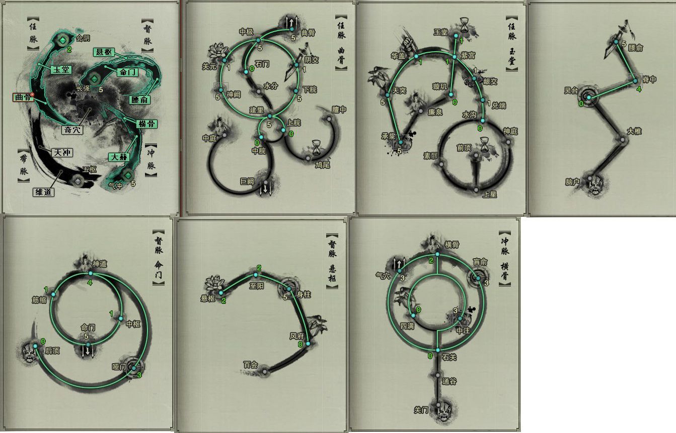 然后是尽快增强人物的能力,同时,点穴过程中尽量减小修为损耗。这里向大家推荐几个性价比很高的穴位:冲脉·气冲(增加内功命中),督脉·长强(增加被疗伤成效),任脉·天突(增加元气),任脉·承浆(增加体质)。另外,任脉·龈交(神行不消耗精力)和任脉·兑端(神行CD减少1小时)事实上是非常好用的穴位,强烈建议大家点开。