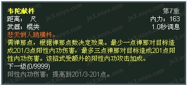 秒伤害略低于[普渡四方],在内功被动[惊神]的影响下,可以获得1点禅那。附带击倒目标2秒效果,并且可以破外防1150,为神技[六和棍]提供点方便。