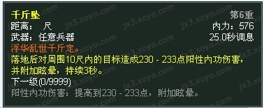优点是范围广,目标无限多,群战利器。但属于轻功范畴,无法在被[吞日月]时使用。伤害略显鸡肋,但偶尔会心也可以到1000。