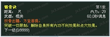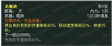 减伤技能,CD短。可以要降低自身移动速度40%(数据库的注释错误),不过装备秘笈《达摩武诀·无相诀》人偶图残页,再同时开[锻骨诀],会有16%的移动速度提升(可惜是BUG)。