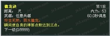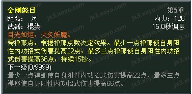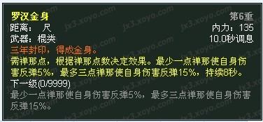 加攻技能,3点禅那可以增加187的内功伤害,非常可观。CD15秒,持续时间也是15秒,理论上可以做到无缝释放。