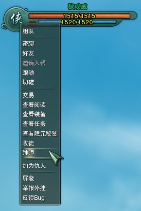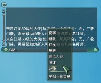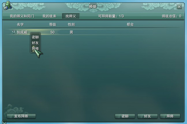 在师徒面板中,通过点击师父和其他同门的角色名,可以轻松的密聊、加好友、组队等。如果一个人游戏寂寞,不妨与同门师兄弟们组队一起游历江湖。
