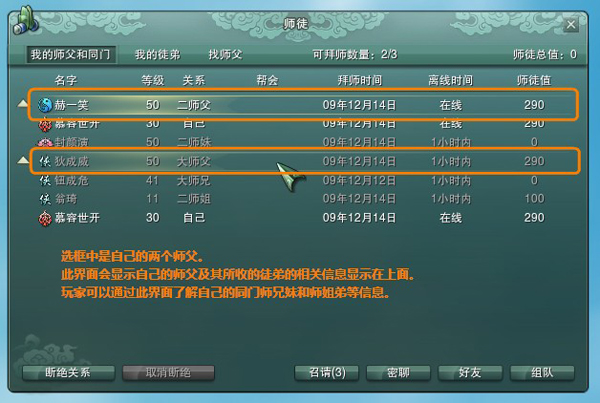 成功拜师后,可以在师徒界面中“我的师父和同门”一列,查看到所有师父的信息和其他师兄妹、师姐弟的信息。系统默认是打开你的师父所收的所有徒弟的角色列表的,包括您自己的相关信息,所以不要奇怪怎么自己也在师父的列表中。同一时期,可以拜3个师父为师,根据时间的前后分为“大师父、二师父”等。也根据入门时间的前后,会有“大师兄、二师妹”等同门,同一时间(包括自己)最多有30个同门师兄弟。