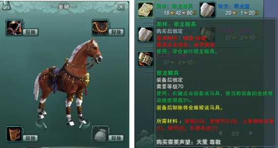 不过,日前江湖风声四起,图样:“银龙鞍具”惊现天策乙字声望商人之手,且只售予天策声望尊敬之人,一时间江湖众人士奔走相告,均想一窥鞍具之原样!如此鞍具,试问天下谁可拥有。除了制作材料珍贵以外,这套“银龙鞍具”相比以往更显美观大方,配于坐骑,霸气十足、英姿飒爽,飘逸而不失沉稳,温和中透着威严,气势惊人,连神佛都不敢等闲视之。而提高3%的移动速度,也为各位玩家的坐骑带来了无可比拟的优势,英雄风采即刻呈现。