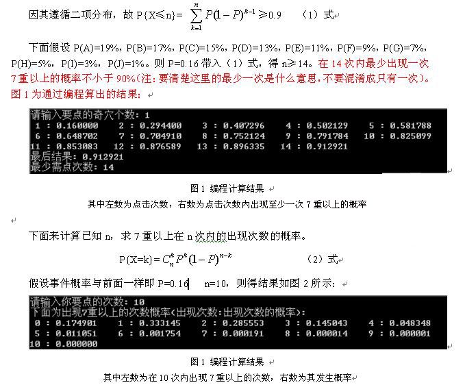 首先,还是先求对一个奇穴而言为使其至少一次发生10重的概率不小于90%的最少需求次数。通过程序计算得其结果为230次。