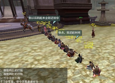 事情的解决显然升级到要PK、甚至真人PK等等,加之起哄的人多,“妖夜游”胆气变壮主动提议去“洛阳发钱,遇到人就发1000金,谁先停止就删号。”