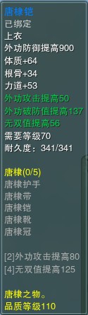 天策唐棣套装:装备2件外功攻击提高80、装备4件无双值提高125。