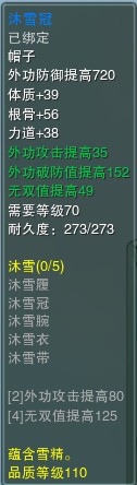 纯阳沐雪套装:装备2件外功攻击提高80、装备4件无双值提高125。