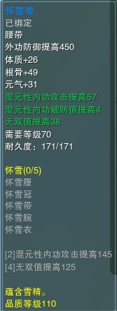 纯阳怀雪套装:装备2件混元性内功攻击提高145、装备4件无双值提高125。