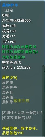 少林晨钟套装:装备2件阳性内功攻击提高145、装备4件无双值提高125。