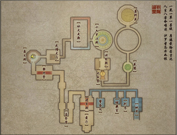 天宝五年,因杨贵妃得宠而接管神策军的杨国忠为削弱与李氏天策府交好的少林,与菩提会合作。菩提会终于在中土有了属于自己的寺院,他们将这座位于洛阳的寺院取名为“战宝迦兰”以纪念天竺总教,人称他们为“天竺迦兰僧”。