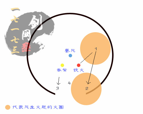 1号点是天策开怪点,饮火第一个风生火起要在这里烧开后天策回2号点;