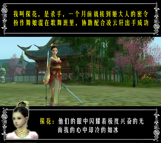 我叫探花,是杀手。在一个月前就接到姬大人的密令,让我扮作舞娘混在歌舞班里。我的任务就是协助和配合凌云轩出手成功。