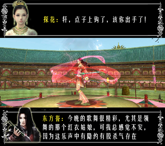 为了缓和气氛,管家杨门书生特意请来了七秀坊的歌舞班,表演已经开始,七秀坊的歌舞果然出色,大厅里的气氛顿时缓和了不少,我看着这表面歌舞升平的景象,自然而然地想起了杀手空的那张索命帖,仿佛杀手空就隐藏在这弥漫着香水味的空气里,随时都会发出致命的一击,到那时白善人就会是死尸一具了,酒菜再好,美女再美都和他无关了。