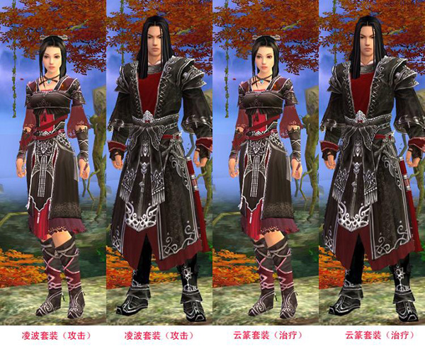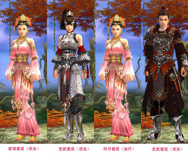 七秀(碧湖套装:内功攻击、怜月套装:治疗)天策(忠武套装:外功攻击)