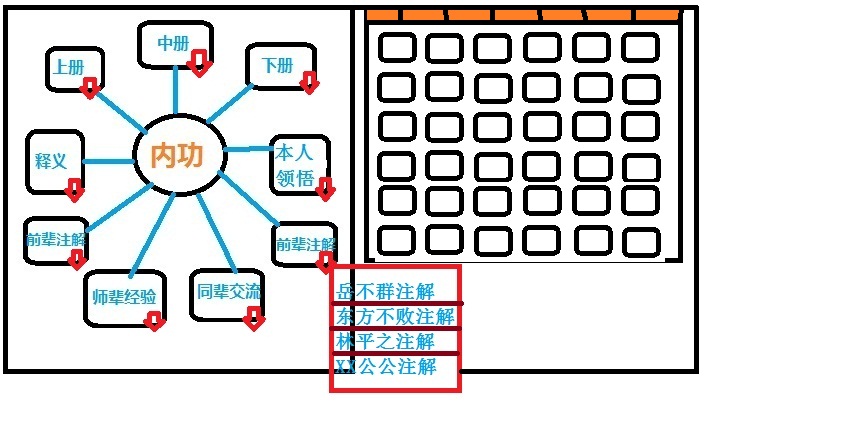 虽然“内功经验”是以书的形式出现的,但此书非彼书,这个“书”使我们领悟的和要参悟的,所以它们不占有包裹空间,而是始终存在于玩家的内功之中,没有“存放”的限制,可以拥有很多。有些“内功经验”是可以在玩家之间交易的,有些是直接参悟(绑定装备)的,当玩家领悟(装备)后,就会一直存在。如何“装备”这些“内功经验”是由玩家自己选择的,大致如下图所示: