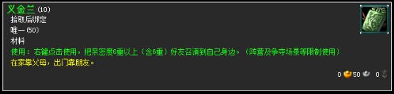 使用说明:右键点击使用,把亲密度6重以上(含6重)好友召请到自己身边。(阵营地图及争夺场景限制使用)