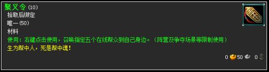 使用说明:右键点击使用,帮众均可使用,指定召唤五个在线帮众到自己身边。