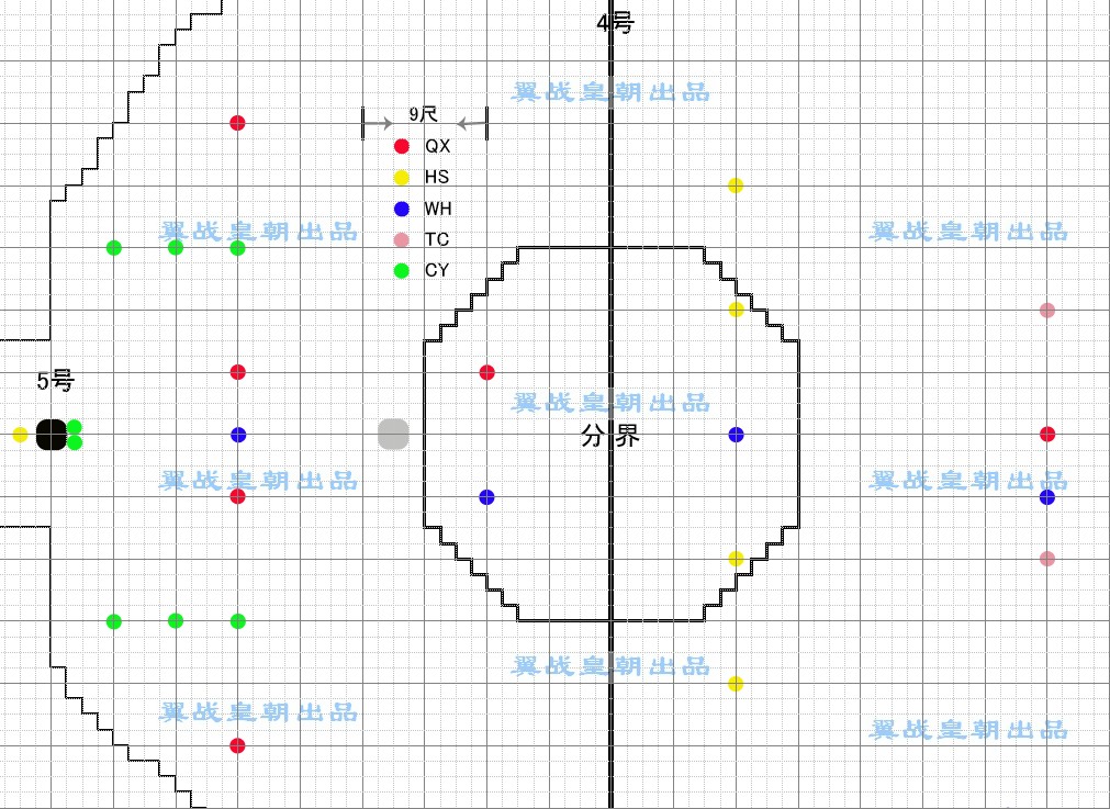 2、此图所有比列均严格按照BOSS房间做成,我们之所以将BOSS拉至5号门即为通往5号BOSS的口子,原因是:BOSS的任何技能包含串火掌·炎华、真·烧云的最远有效距离均为70尺,而如此站位的话,图中最靠右边边线的队员刚离BOSS约在75尺左右。