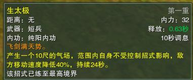 假设场景1,两个剑宗脚下都有生太极吞日月在,并且相互有过输出接触。意思就是没有气了。逃也逃不掉,而某一方随便放了一个气场准备聚气或者协助输出用。您可以果断打断,获得3格气,砍一刀返身跑,这就算你占了便宜了。在双方都精疲力尽的时候运用,最为恰当了。 效果3:下马,不用解释了吧。 生太极:没错,运用必须恰当。