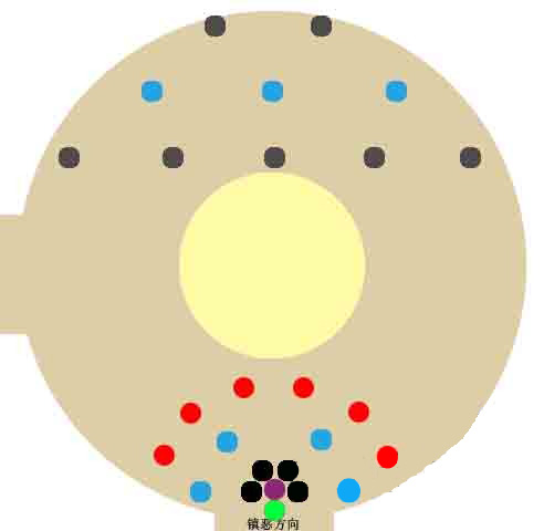 主T拉在门口方向不要太靠后,以免当到治疗视角。加主T的治疗,建议一七秀一万花。分站主T左右两侧。另外两个治疗建议七秀,瞬间刷血快。黑色为近战DPS。可剑纯可天策无所谓。