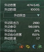 外功攻击2180、外功会心伤害150%、外功伤害474-545、武器伤害107-178。